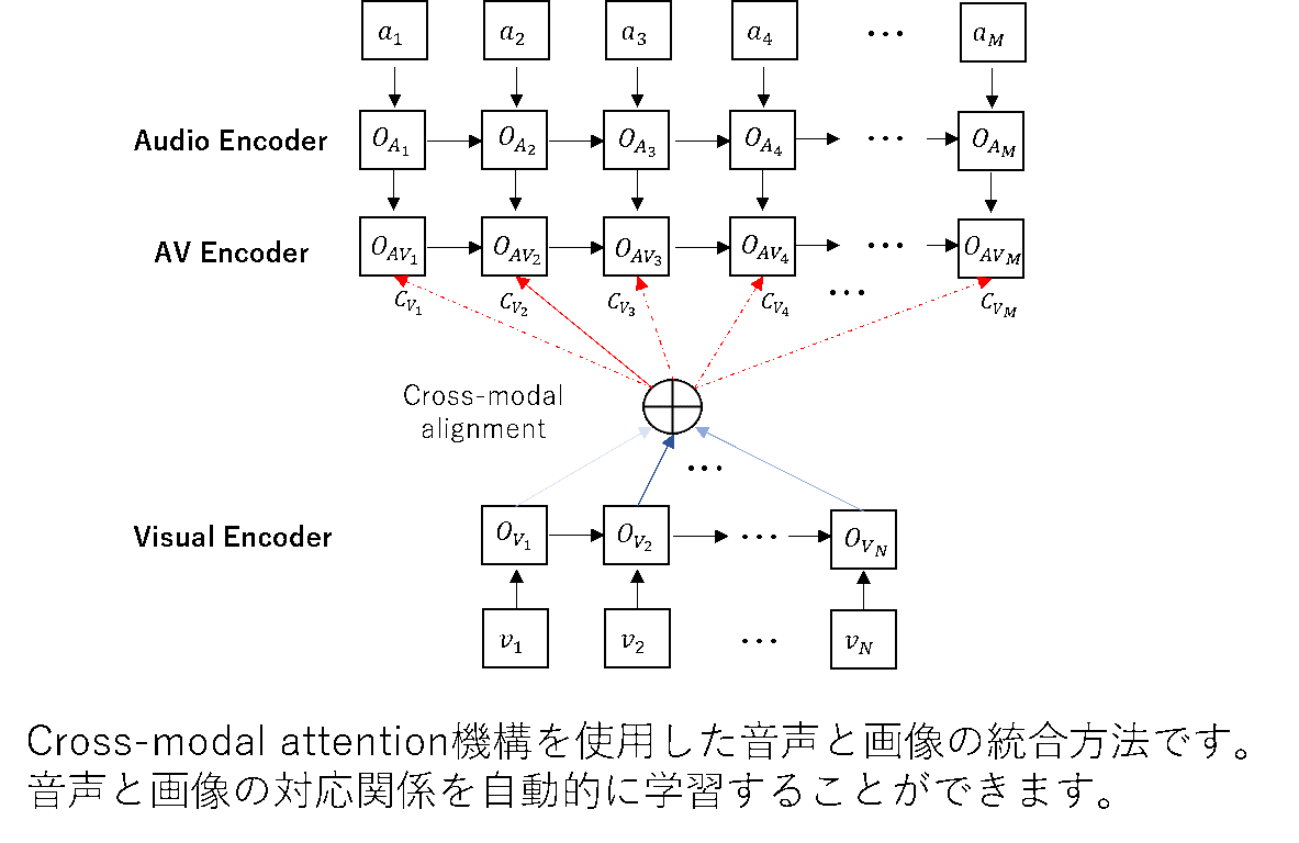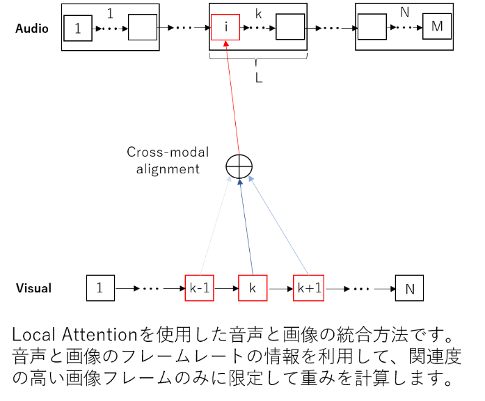 マルチモーダル音声認識において音声と唇画像の情報を統合する様々な手法が研究されています。 本研究では,ある時刻の音声に関係する唇の画像は全体の一部であるという考えに基づいて、重みの計算を一部の画像フレームに限定するLocal attentionを用いた統合方法を提案しました。