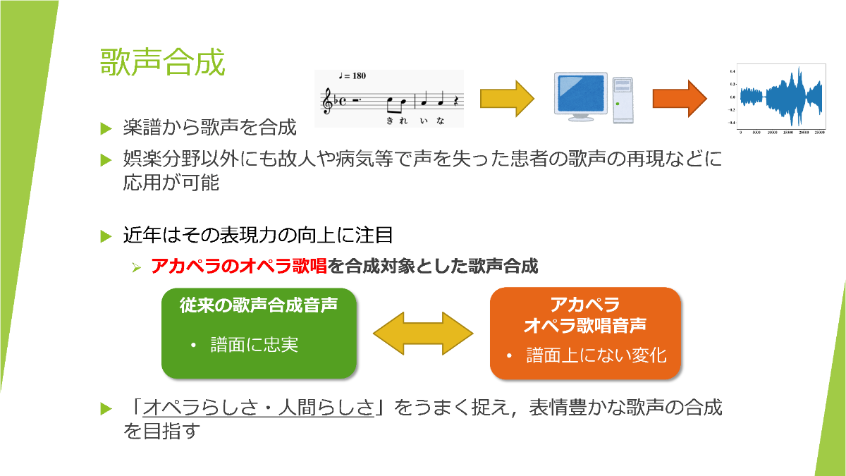 歌声合成はデジタル化した歌詞付きの楽譜から歌声音声を生成する技術です.この技術は初音ミクなどのボーカロイドに用いられており,娯楽分野で広く利用されています. またこの技術は故人の歌声の再現(具体例として2019年紅白歌合戦でのAI美空ひばり)や病気等で声を出せなくなった人の歌声の再現などへの利用も可能です.