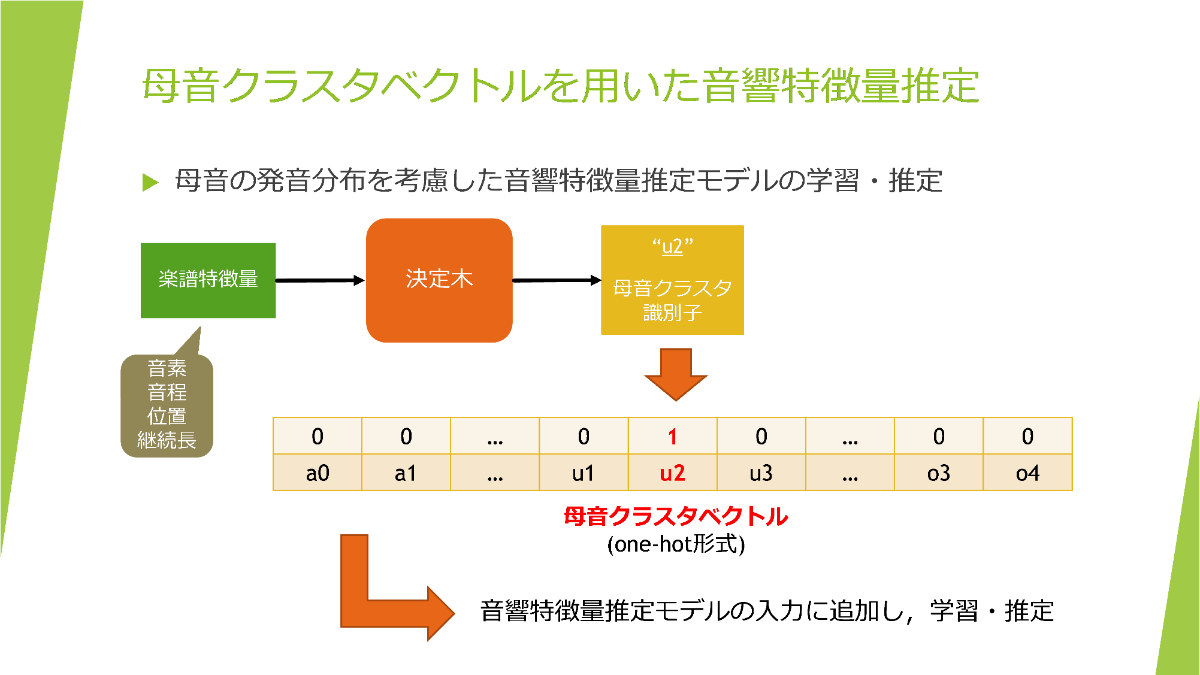 また歌唱音声の合成品質が向上するにつれ,人間の歌唱表現を再現する手法についての研究が着目されるようになりました.ただ楽譜通りに歌う音声を生成するのではなく,歌唱者のクセや特徴,表現を歌唱データの分析によってうまく捉え,歌声合成時にこれらを考慮して人間らしい表情豊かな歌声を生成します. 歌唱データとして伴奏のない独唱によるオペラ歌曲の歌唱データを用い,その特徴的な表現を考慮した歌声合成がアカペラオペラ歌唱合成を可能とします.