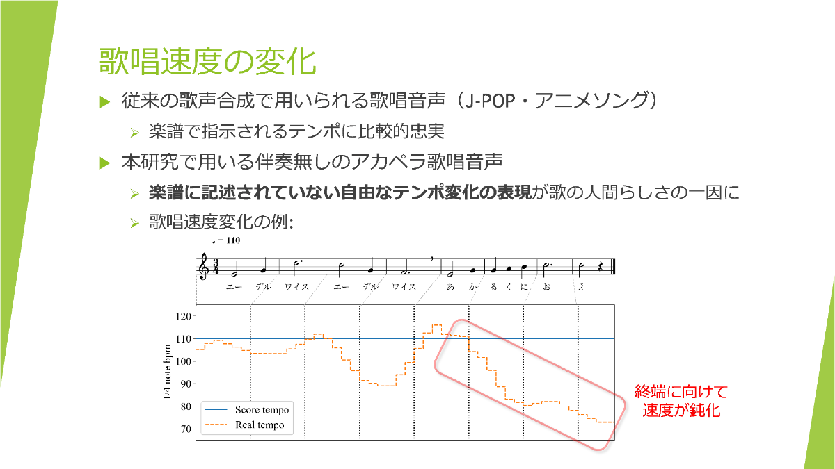 アカペラ歌唱では伴奏が存在しないということから,その歌唱速度が歌唱者に大きく依存します.楽譜上では一定のテンポで歌唱するよう指示されていても,実際は歌唱者のクセに由来するテンポの変化がみられます.例として,曲の終盤になるほど歌唱速度は鈍化していく傾向が挙げられます.歌唱速度の変化は,歌唱者の特徴を大きく示したものといえるでしょう.