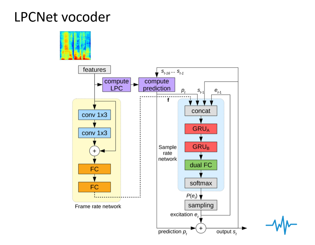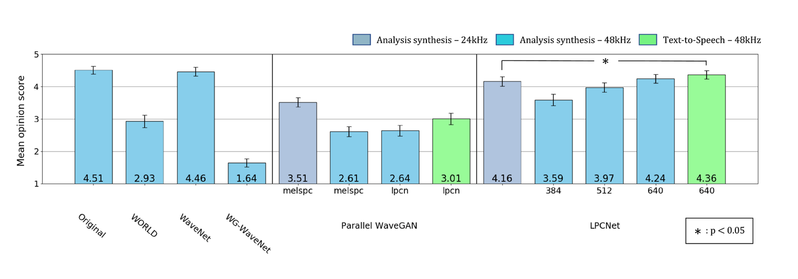 ボコーダは,以前は機械的なアルゴリズムを用いて音声を復元していましたが,音響特徴量は音声の位相情報などが欠落していることから完全な復元が出来ず,品質に限界がありました.そこでニューラルネットワークを用いてボコーダを構成することでその問題を克服し,自然音声と見分けがつかないほどの高品質な音声を合成することが可能になりました.私たちの研究室では,学習データ量や計算資源が限られている環境でも高品質な合成が可能なニューラルボコーダとして,Full-band LPCNetを提案しました.