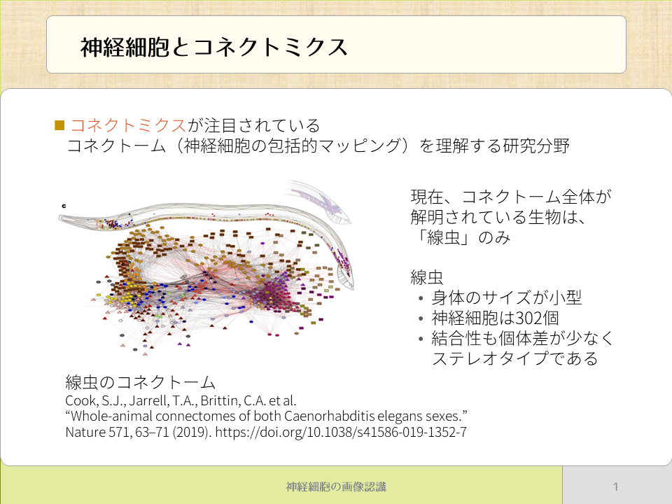 近年,神経網の理解のために,生物の神経系内の神経細胞の包括的な接続マップ(コネクトームと呼ぶ)を研究するコネクトミクスという研究分野が注目を浴びています.現在,コネクトームが完全に解明されている生物は線虫(Caenorhabditis elegans)のみです.線虫の神経系は以下のような特徴があります.