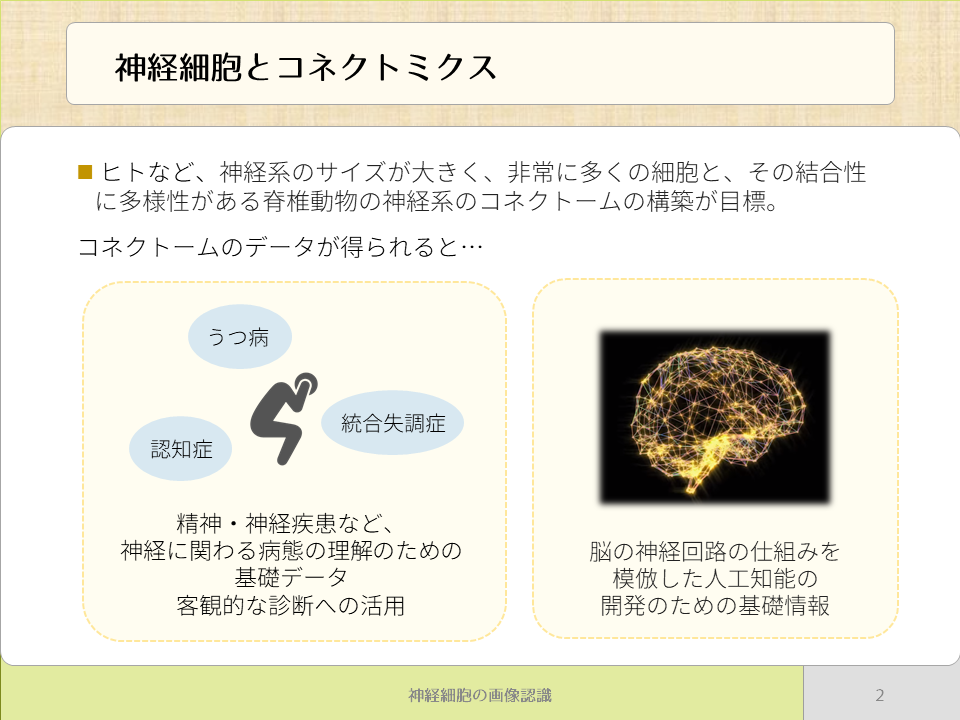 神経細胞は,生物の体や精神を理解する上で非常に重要な要素です.神経細胞同士はシナプスで接続されており,全体として巨大な神経網を形作っています.この神経網の構造を理解することは,生物の身体的・精神的疾患を理解するために重要なことの1つです.