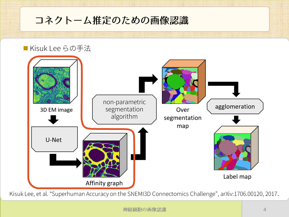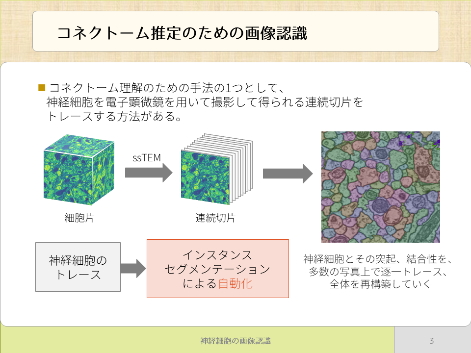 コネクトーム推定の1つの手法として,電子顕微鏡を用いて三次元的に撮影された画像を用いる手法があります.連続切片の形で撮影された細胞片の多数の写真に対して,一枚ずつ,神経細胞とその突起,結合性を逐一トレースし,全体を再構築していくものです.この神経細胞のトレースは従来専門家の手により行われていましたが,その作業コストと専門性の高さが問題となってきました.