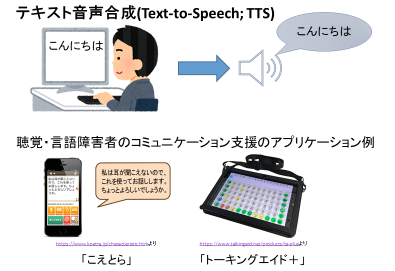 テキスト音声合成とは、文章(テキスト)を入力すると、その音声を機械が生成する技術です。