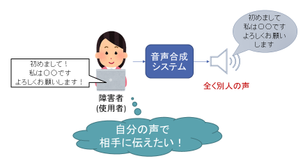 この技術は、機械との対話だけでなく、発話障害者のコミュニケーション支援にも役立てられることが期待されています。(発話障害者:運動に関する神経等の病気により、発話が困難な方。)しかし、現状のテキスト音声合成システムは、あらかじめ機械に学習させた人の音声しか生成することができません。