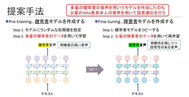 提案手法では、まず健常者の音声を学習データとして、ディープニューラルネットワーク型のテキスト音声合成モデルを学習させます。 そして、学習された音声合成モデルのパラメータを初期値として、さらに発話障害者の音声を学習データとして、音声合成モデルの再学習を行います。