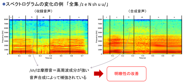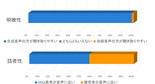 提案手法を用いて合成した音声の聴取実験を行った結果、「元々の発話障害者音声よりも合成音声の方が聞き取りやすい」という回答が97.5%となりました。また合成音声が、障害者本人の声と別人の健常者の声のどちらに近いかという質問に関しては、57.5%が障害者本人の声に近い、という回答が得られました。このことから、ある程度の本人らしさを担保しつつ、聞き取りやすい音声が合成できたことが確認できました。